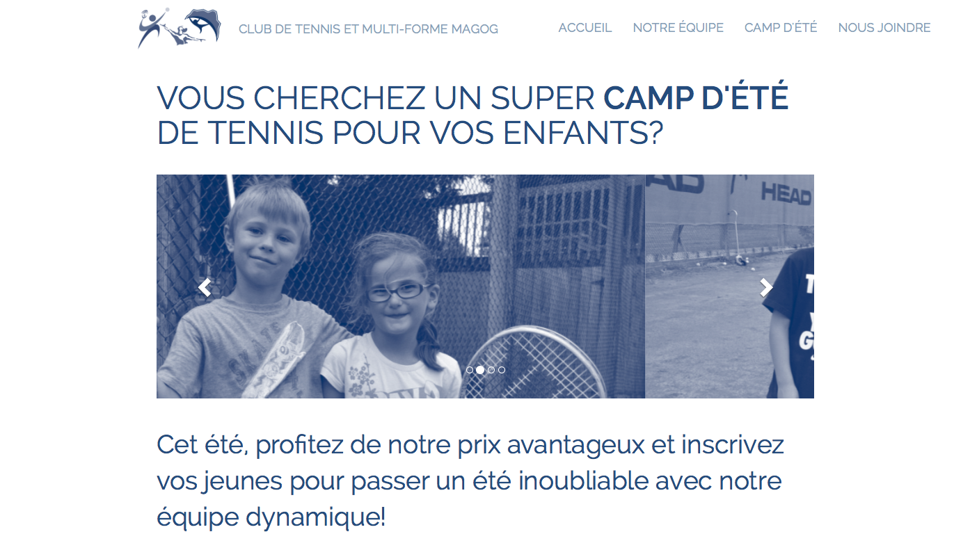 J'ai conçu le site web du Club de tennis et Multi-Forme Magog en collaboration avec Erick Lamontagne, designer web. Il s’agit d’un site adaptatif, optimisé pour les moteurs de recherche et facile d’utilisation. De plus, j'ai créé des formulaires personnalisés permettant l'inscription de clients directement par courriel.