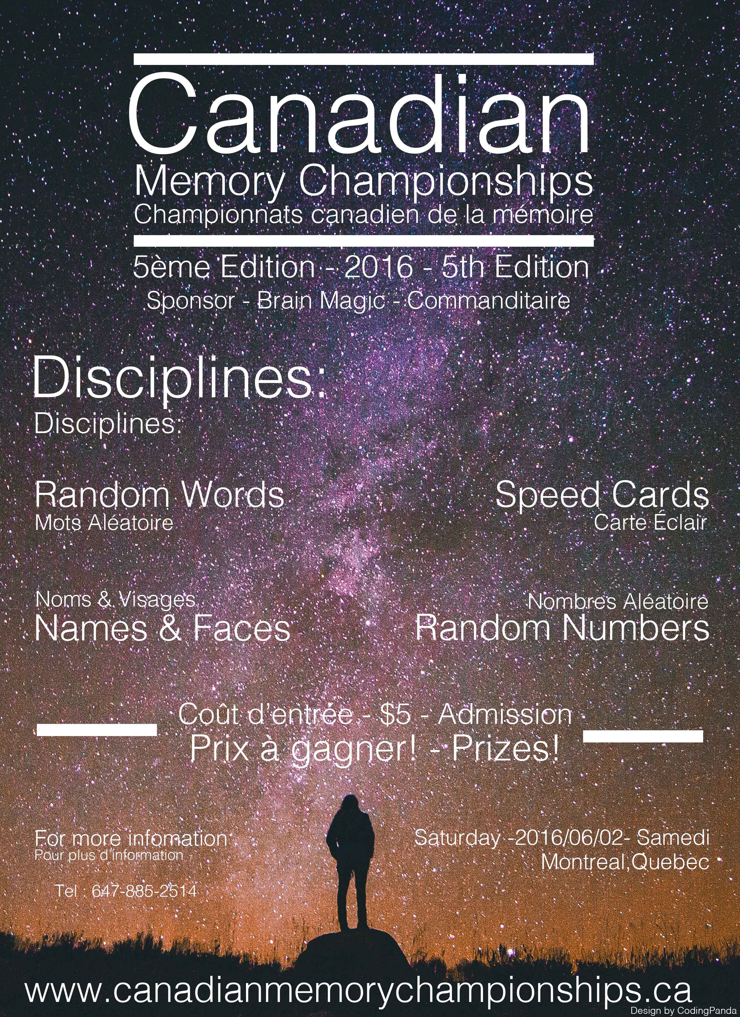 Après que j'ai participé au championnat de mémoire du Canada, je me suis impliqué dans l’événement. Le championnat de mémoire est l’opportunité aux athlètes de mémoire de confronter leur capacité de mémoriser des paquets de cartes, des noms, des mots aléatoires ou encore des nombres aléatoires.